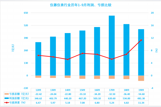 1.2 儀器儀表行業2019年1-9月利潤總額波動分析