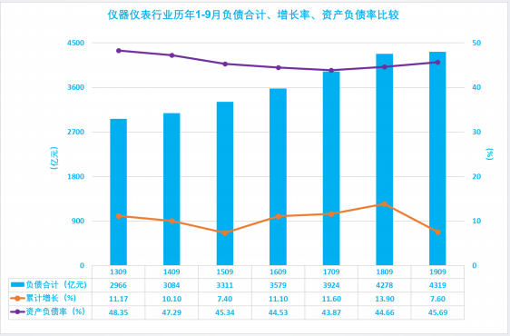 2.10 儀器儀表行業曆年1-9月負債合計、增長率、資產負債率比較