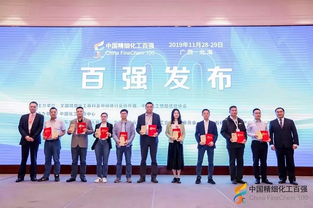 2019年11月28日,在由全國精細化工原料及中間體行業協作組、中國化工情報信息協會在廣西北海聯合主辦,中國化工信息中心承辦,北海市鐵山港區人民政府、北海市鐵山港(臨海)工業區管理委員會協辦的“第十九屆國際精細化工原料及中間體(鐵山港)峰會暨2019中國精細化工百強發布會”上,公布了“2019中國精細化工百強”榜單。